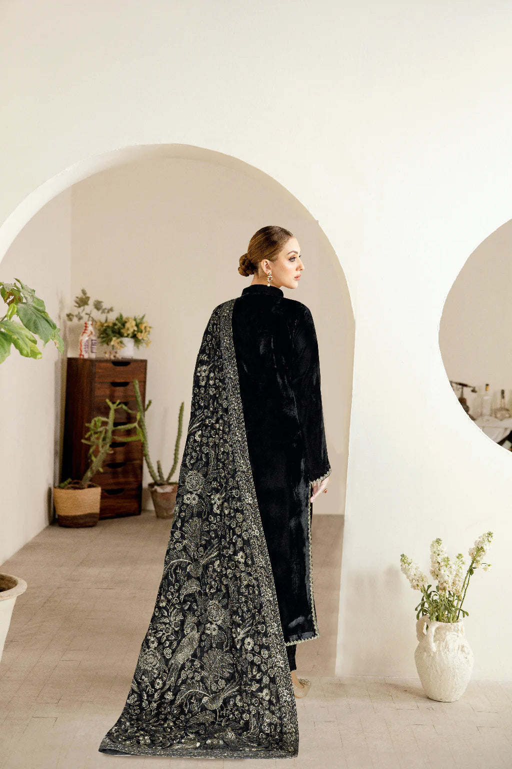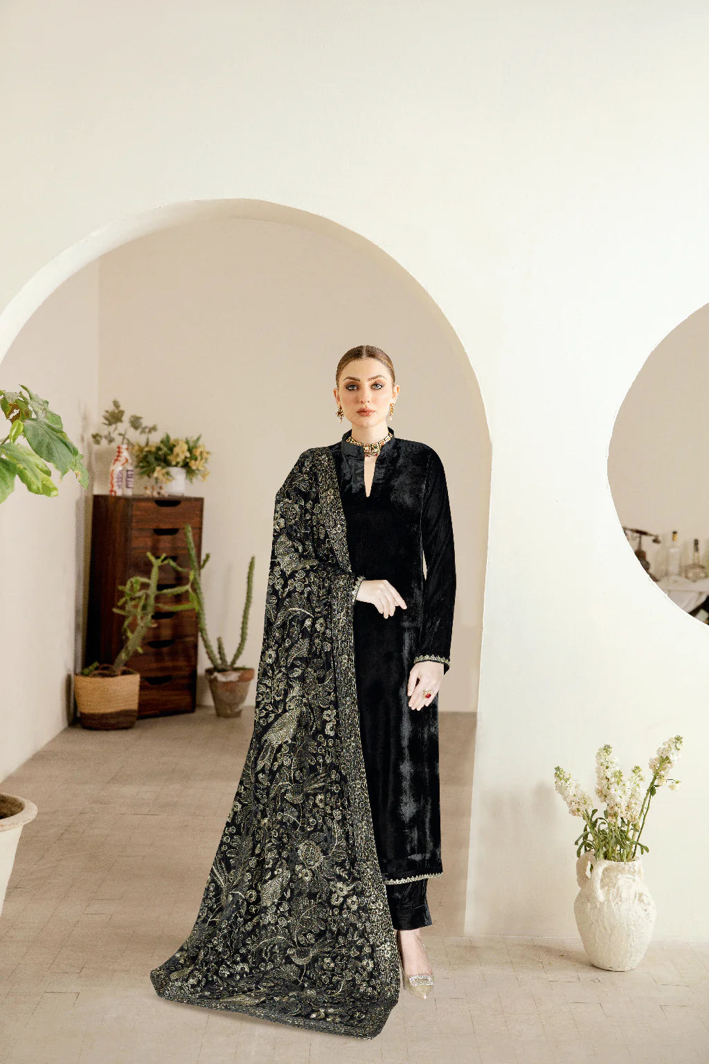 Embroidered velvet shawl Includes a shirt and straight pants
